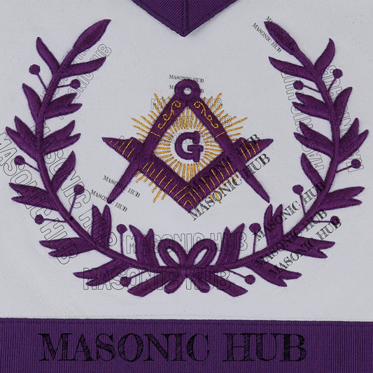 Master Mason Lambskin Apron with G Logo, Radiant Sunburst, and Laurel Wreath