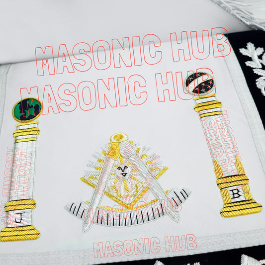 Past Master Lambskin Apron with Sunburst Emblem, Pillars, Silver Bullion Fringe & Eye Flap – Masonic Hub