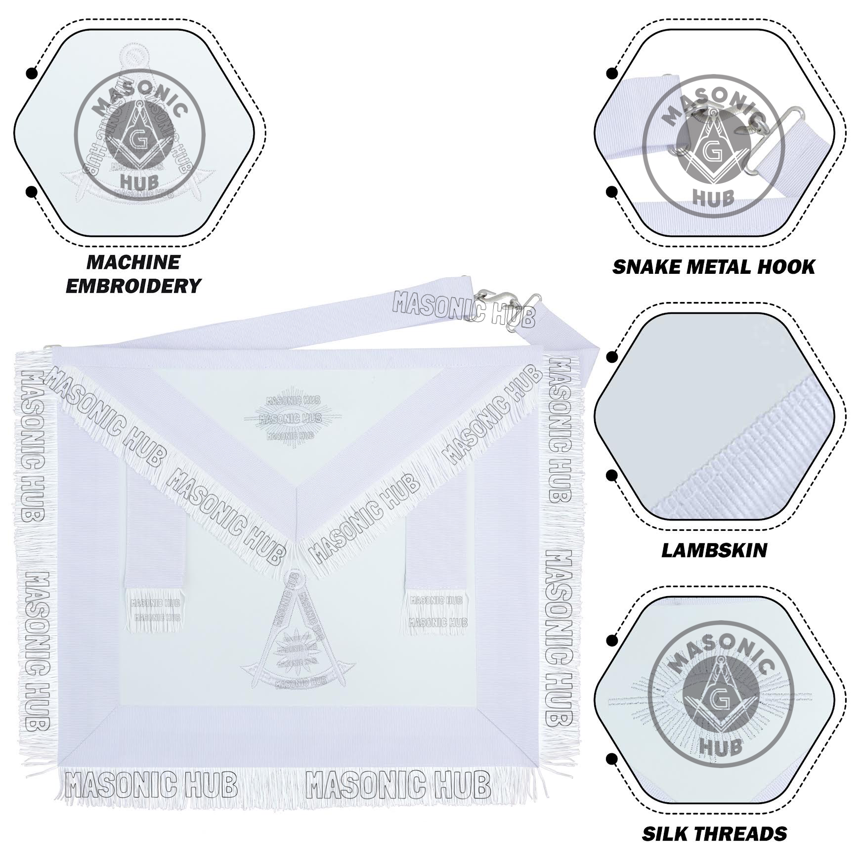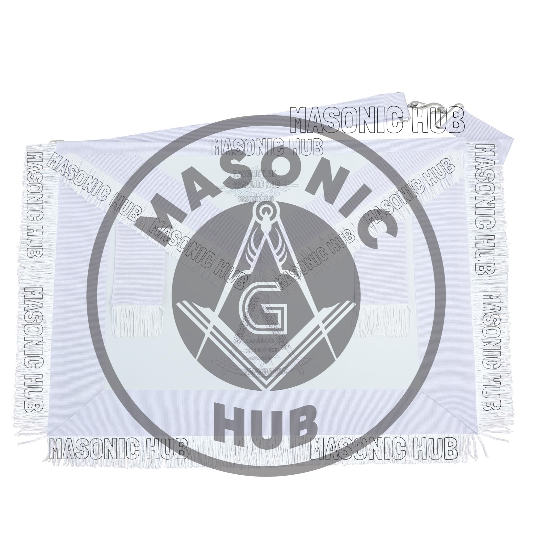 Masonic Past Master All White Apron – Compass & Quadrant with Sun Embroidered & Fringe