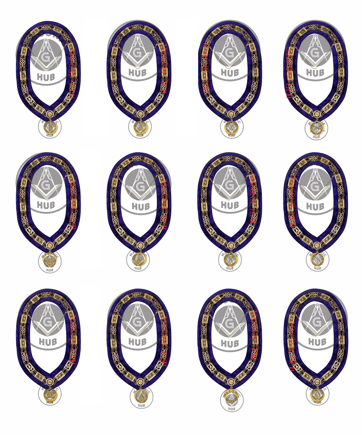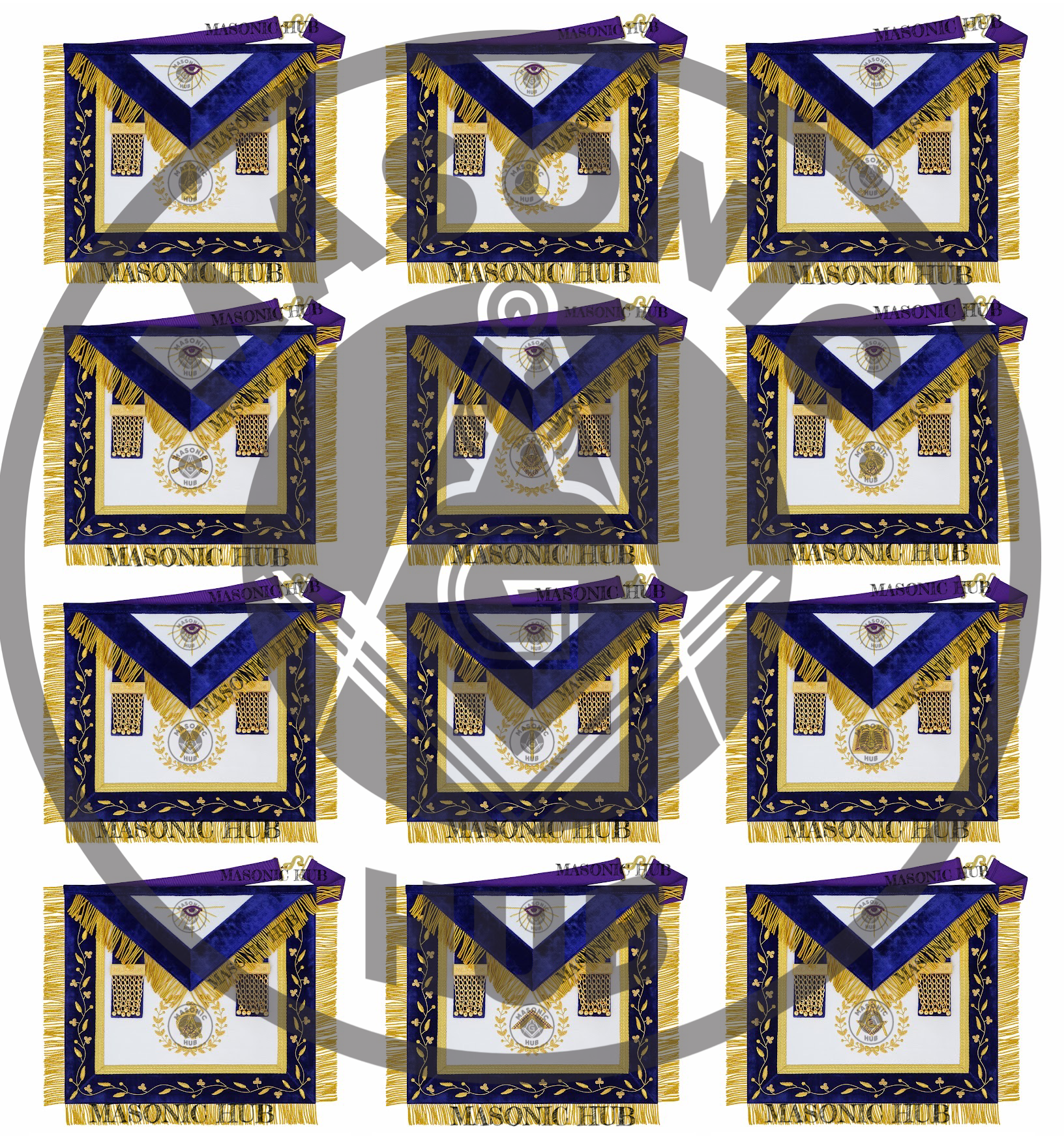 Grand Lodge Officer Aprons Set of 12 – Freemason Lambskin Regalia with Gold Bullion Hand Embroidery, Chain Collars, Jewels & Cuffs