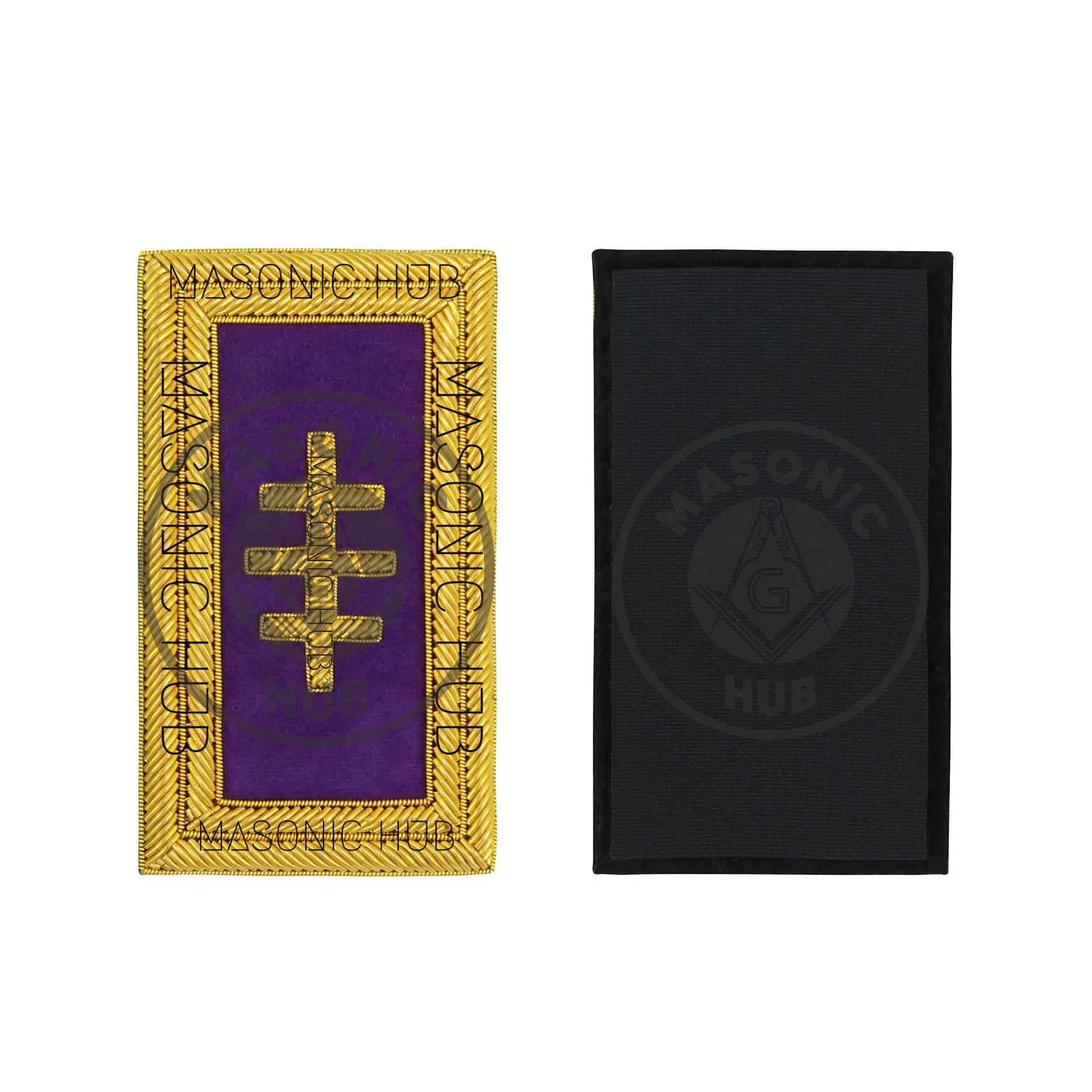 Each shoulder board is handcrafted using rich purple velvet, a color that signifies wisdom, dignity, and high office within the Knights Templar Grand Encampment. The central Patriarchal Cross, meticulously embroidered in fine gold bullion, represents the authority and honor of the Past Most Eminent Grand Master.
